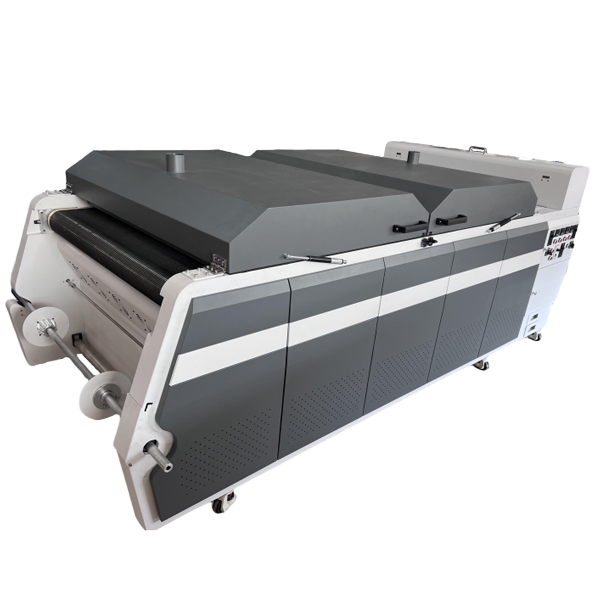 Maskinen påfører polyamid hot melt pulver jævnt, tørrer printet i den indbyggede ovn, køler det effektivt ned og ruller det automatisk op – klar til varmepres eller videresalg.